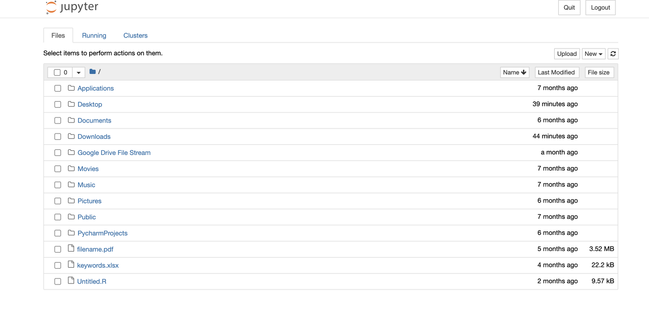 - Anaconda Navigator 화면에서 'Jupyter Notebook' - 'Launch' 버튼을 클릭하면 아래 화면과 같이 Jupyter Notebook Website가 열린다.