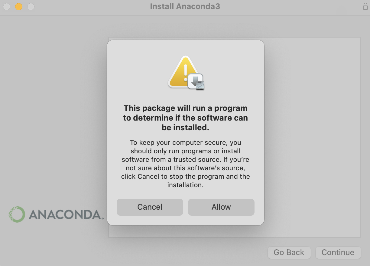 - Anaconda.pkg 파일 클릭한 후 아래 화면에서 'Allow' 버튼을 클릭한다.