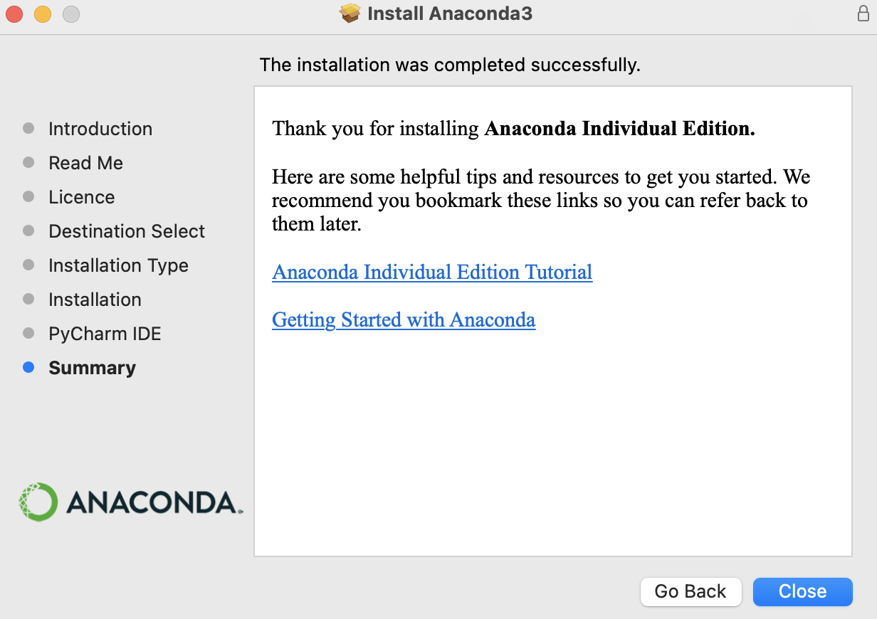 - 아래와 같이 설치가 완료되었다는 메시지를 확인했다면 'launchpad'에 가서 'Anaconda Nevigator' 앱을 클릭한다.
