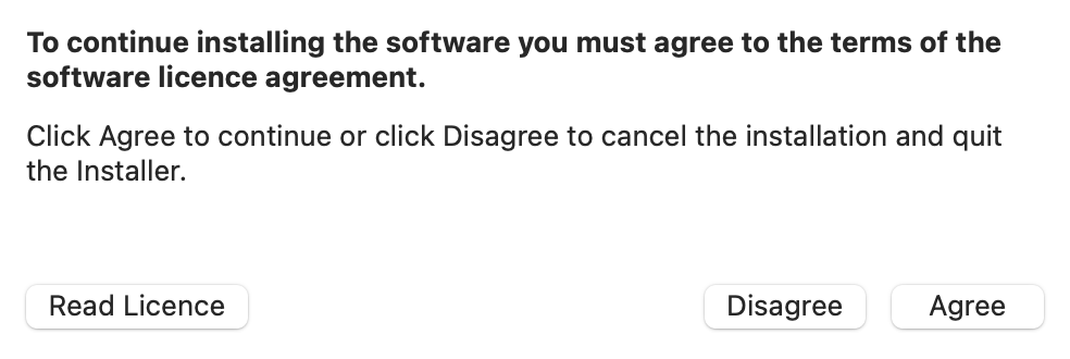 - Licence 단계에서 Continue 버튼을 누르면 아래와 같이 Licence Agreement 확인 Alert 창이 나온다. 'Agree' 버튼을 누르면 된다.