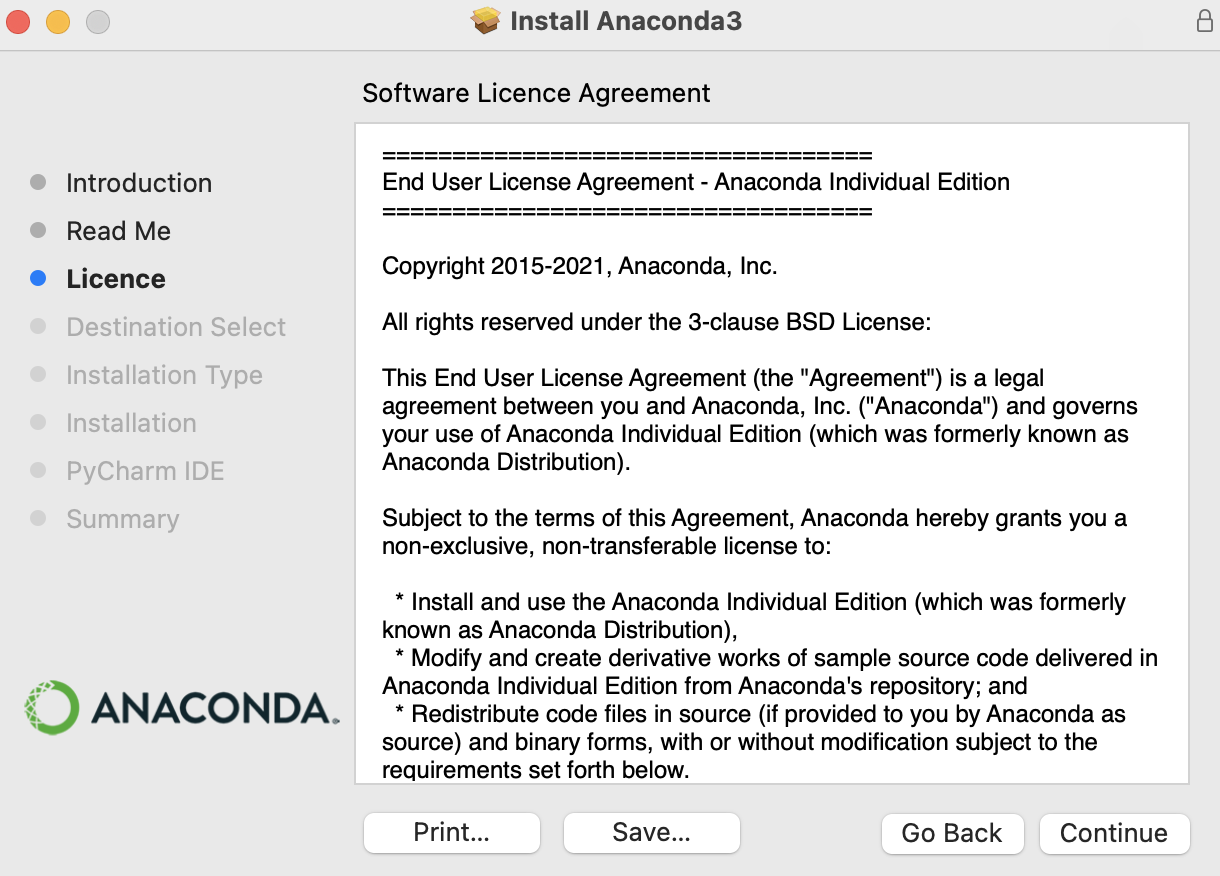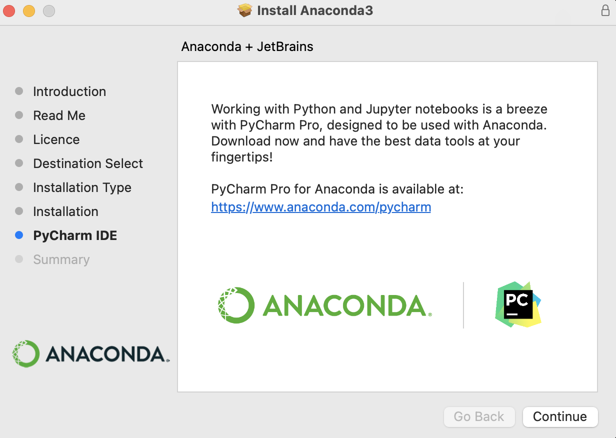 - 아래 화면은 Anaconda에서 제공하는 PyCharm IDE 소개 화면이다. 한번 써보라고 얘기하는 거고 우리는 Jupyter를 사용해야 하기 때문에 Continue 버튼을 누르면 된다.
