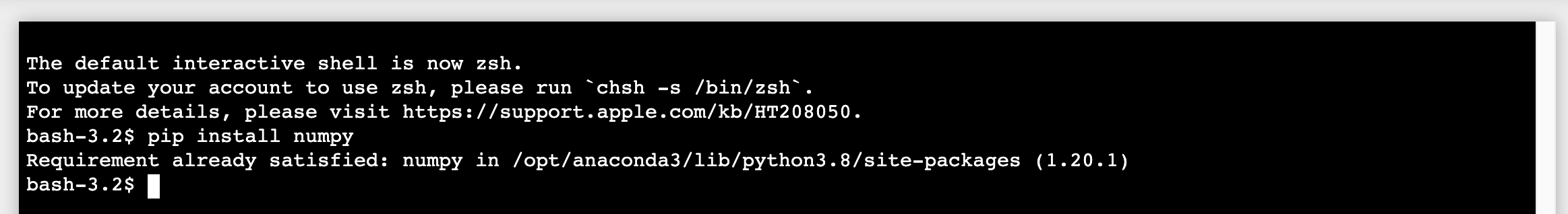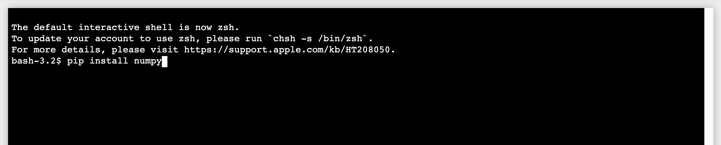 그럼 테스트로 NumPy를 설치해보도록 하겠다. NumPy는 파이썬에서 배열 구조 생성, 수치 계산 등의 기능을 갖춘 패키지 중 하나이며, pandas와 같이 가장 많이 쓰이는 패키지이다. pip 안에는 일부 패키지들이 내장되어 있는데 NumPy는 처음 사용할 경우 한번 설치를 해줘야 한다. 아래 명령어를 위 검은 화면 (터미널)에 입력해주면 된다.