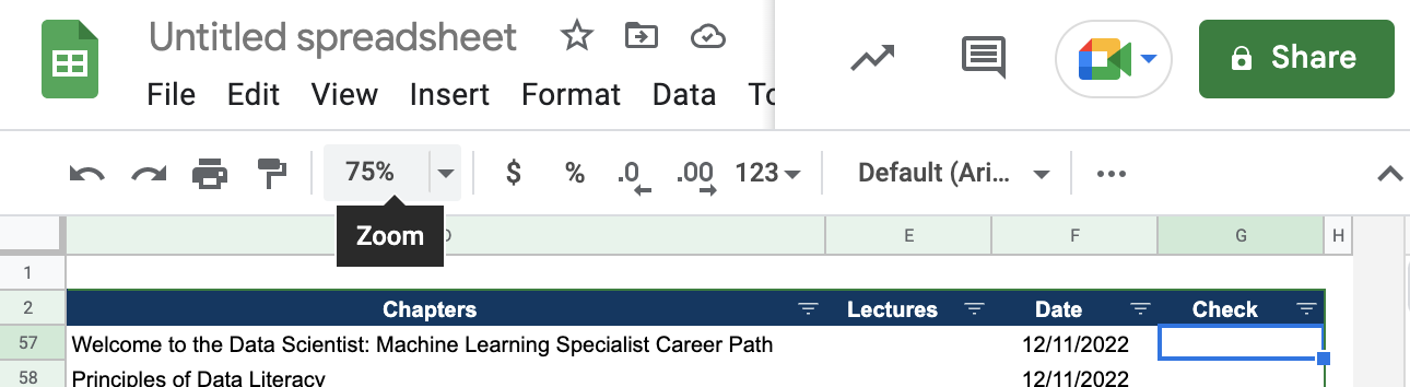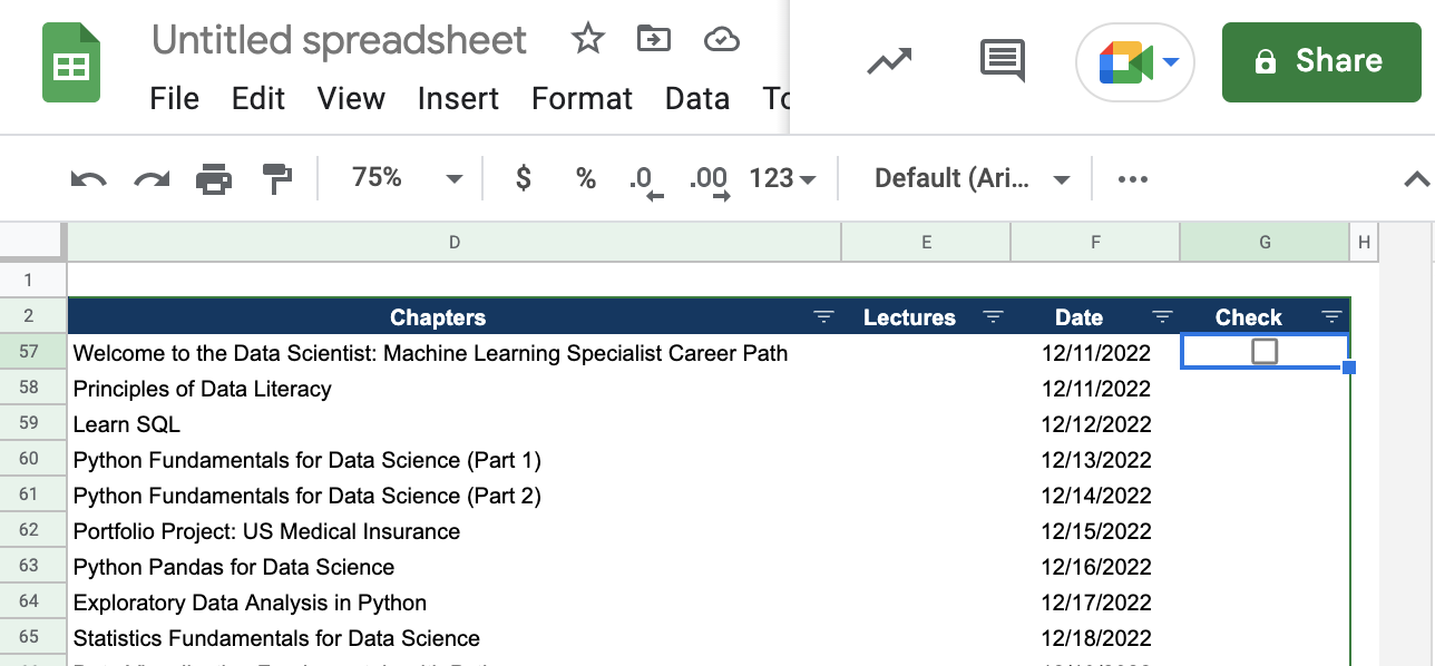 1. 체크박스를 추가할 셀을 선택한다.