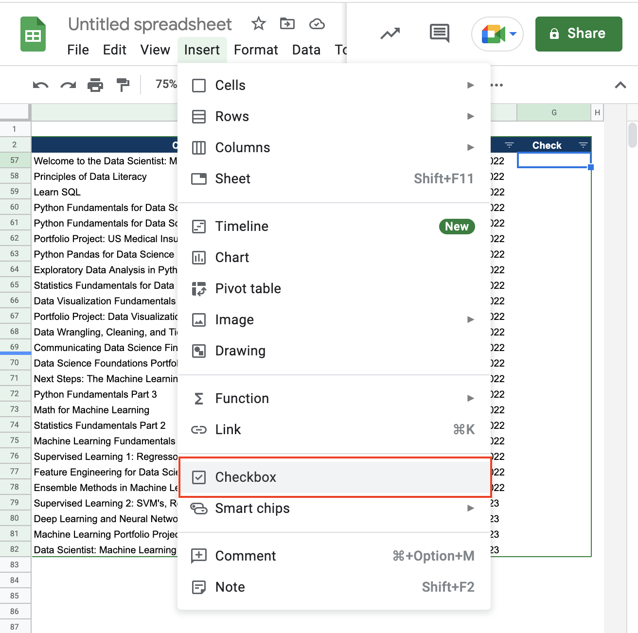 2. 상단 메뉴바에서 삽입(Insert) > 체크박스 (Checkbox)를 클릭한다.
