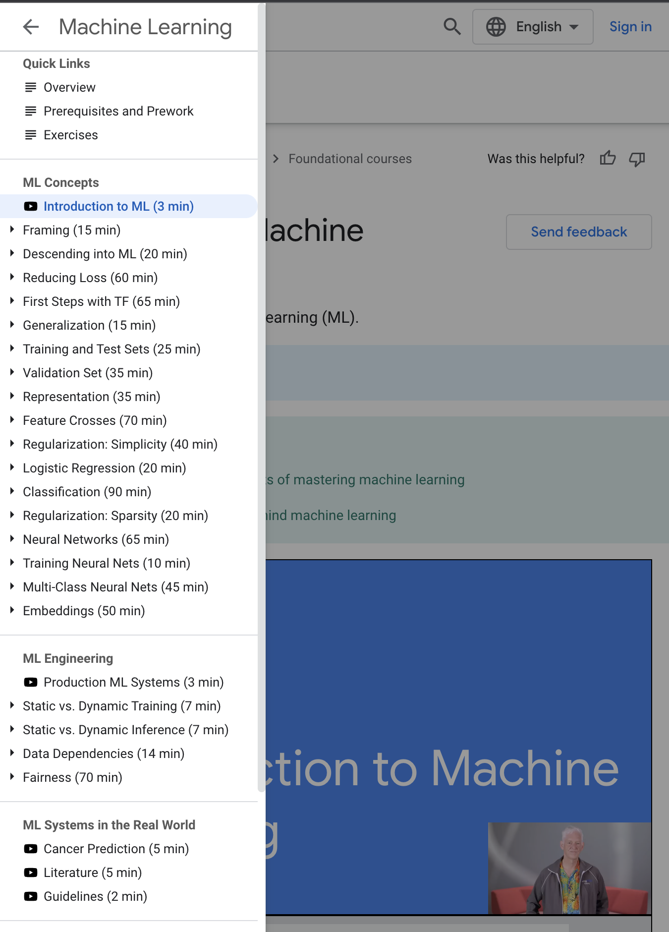 크게 ML (Machine Learning) Concepts, ML Engineering 즉, 머신러닝 기초 이론과 머신러닝 엔지니어링에 대한 기본 내용을 다루게 된다. 강의 형식은 3-5분 내외의 비디오, 텍스트 설명, 그리고 간단한 실습 과정으로 이루어져 있다. 한 가지 아쉬운 점은 해당 과정을 수료한다고 해서 수료증이 따로 나오지는 않는다.