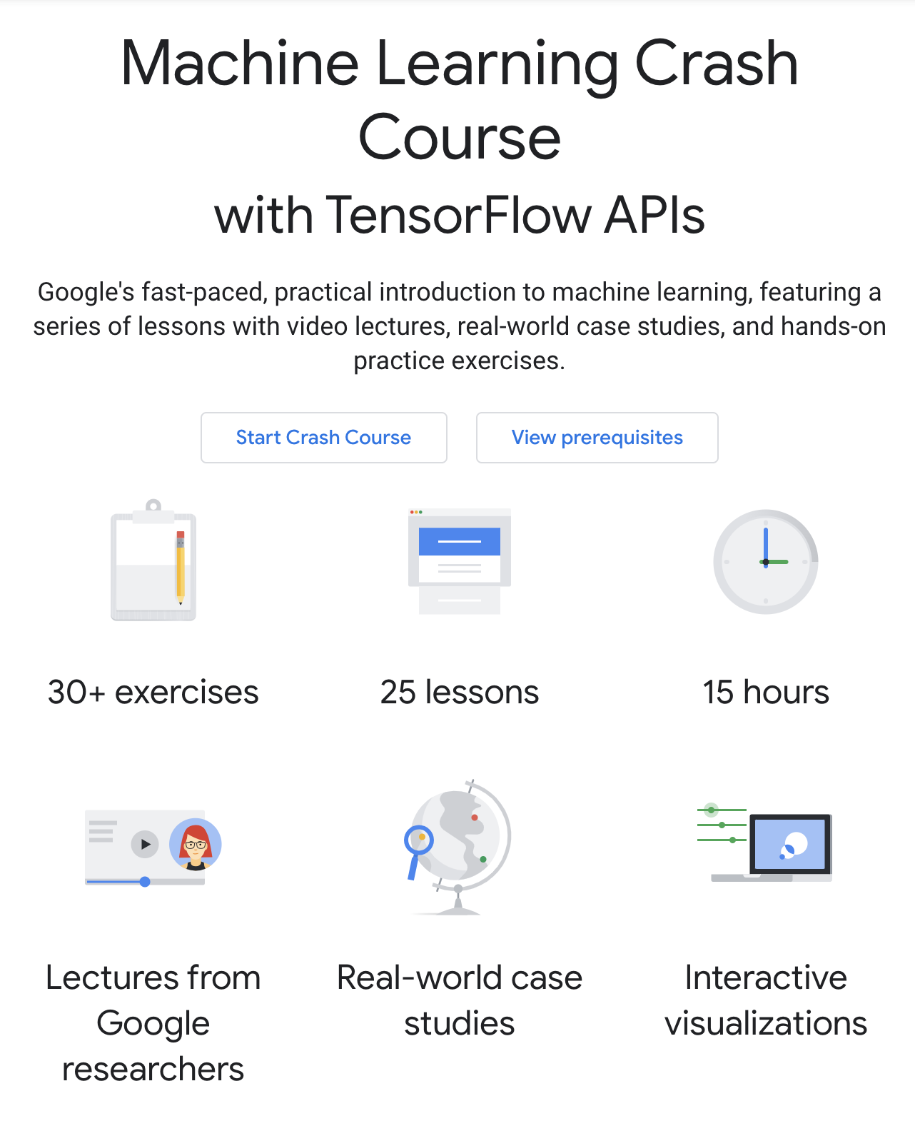 머신러닝과 머신러닝 엔지니어링 기초 개념을 빠르고 간단하게 배우고 싶다면, 구글에서 무료로 제공하는 15시간 분량의 텍스트, 비디오 형식의 머신러닝 크래쉬 코스 (Machine Larning Crash Course)를 통해 공부해 보자. (영어, 한국어)