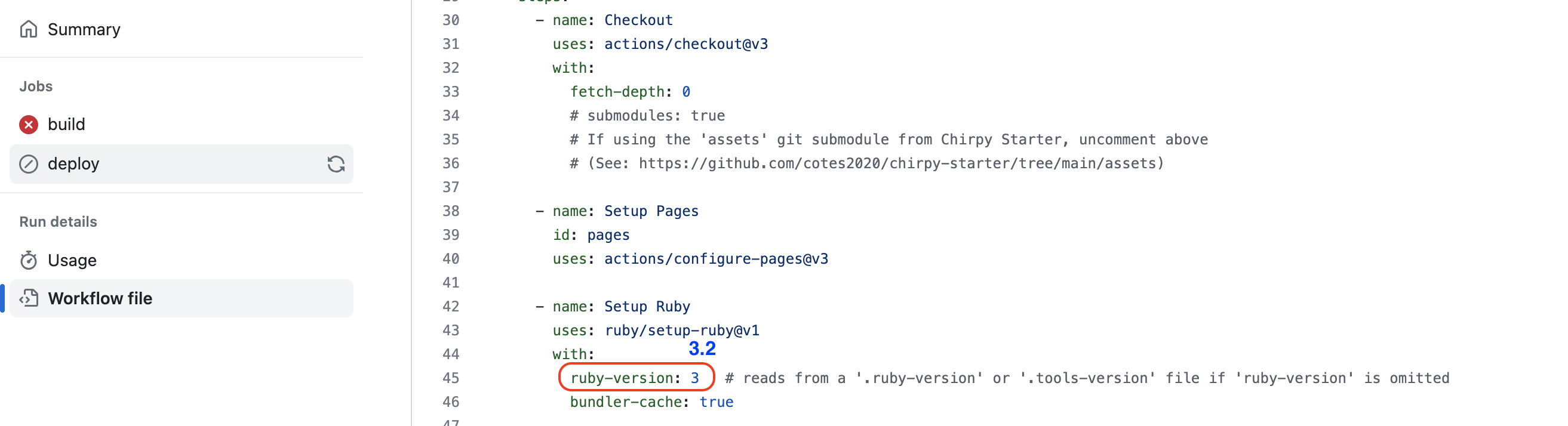 3. 아래로 스크롤하다보면 ruby-version: 3 이 나온다. 이걸 3.2로 수정해준다.