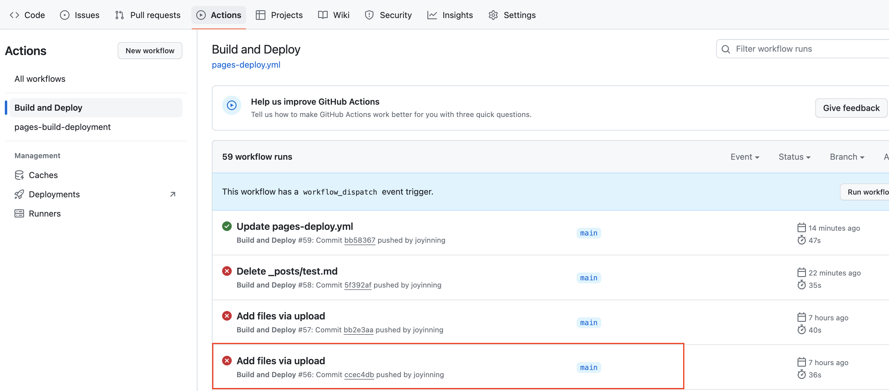 1. Actions > 에러가 발생한 Commit을 클릭한다.