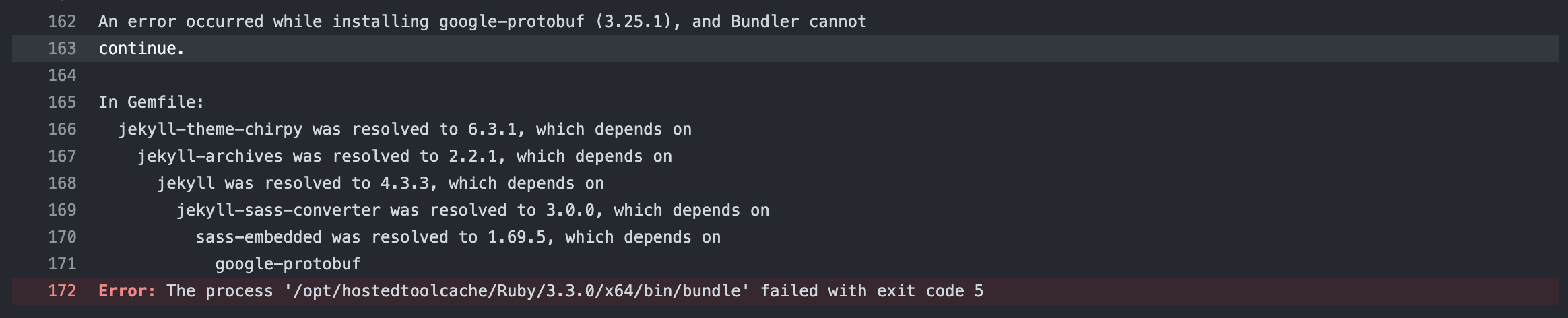 에러 메세지를 보아 하니 Ruby를 셋업하는 과정에서 에러가 발생한 듯 하다. (해당 포트폴리오는 Ruby라는 언어를 사용했다.)