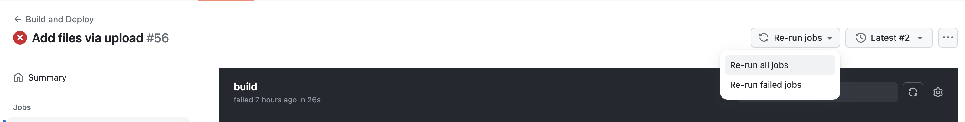 4. 아래와 같이 Re-run jobs을 클릭해서 해당 커밋을 다시 실행하거나 새로 커밋을 만들면 오류가 발생하지 않는다!