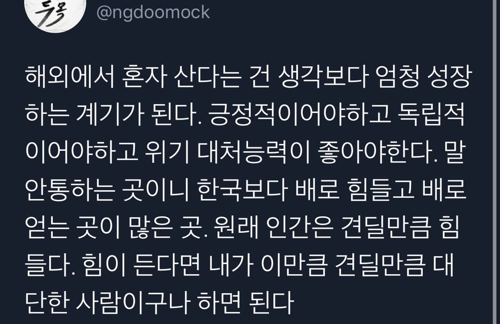 2022년까지 미국에 거주하는 유학생들은 6만 명이 넘어가고 있고 미국 내 한인은 200만명이 넘는다는 통계자료가 있다. 그 만큼 많은 한국인들이 해외에서 꿈을 향해 달려가고 있다. 이전에도 학부 생활 역시 미국에서 했었고 지금 석사 생활도 미국에서 하고 있지만, 한편으로는 남의 나라에서 사는 것 자체가 버겁고 힘들 때가 있었다. 외로운 마음, 힘든 감정을 위로 받고 싶어도 남들도 다 꾹 참고 하는데 나 혼자 엄살 부리는 것이 아닌가 싶었다. 그래서 차마 남들에게 말하지 못하고 혼자 외로움을 달래곤 했었다. 그러나 위 트윗처럼 해외에서 혼자 살면 생각보다 엄청난 성장을 겪는 계기가 된다. 그리고 이 트윗을 보면서 힘이 들면 이 것도 못 견디는 나 자신에 대해 슬퍼하는 것이 아니라 이만큼 견딜만큼 지금까지 버티고 있으니 대단하구나 라는 긍정적인 마인드를 다시 한번 떠올리게 되었다. 이 트윗이 오늘날의 내가 느끼는 힘든 감정을 위로해주었다.